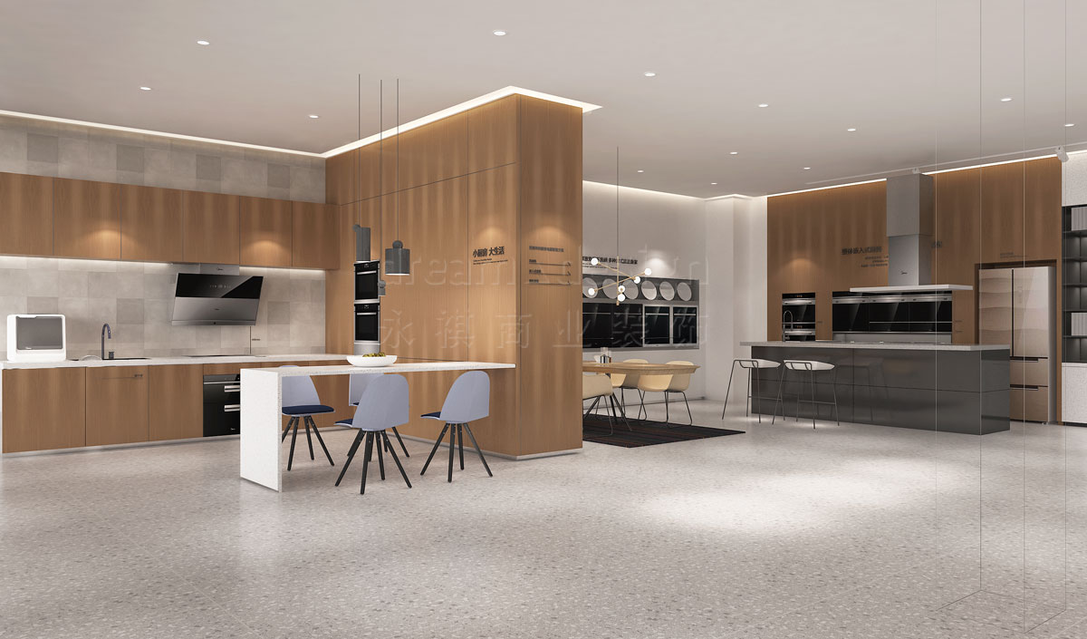 在美的智能全屋家電體驗館的空間設(shè)計中,永祺以美的“慧生活”的主題設(shè)計理念,展示美的智能電器在家居生活場景的運用。與以往單純展示電器不同,在設(shè)計中營造出真實的家居氛圍,從燈光到空間布局,以真實家居環(huán)境為基礎(chǔ),讓客戶切身感受美的智能電器在居家生活中帶來的便利。